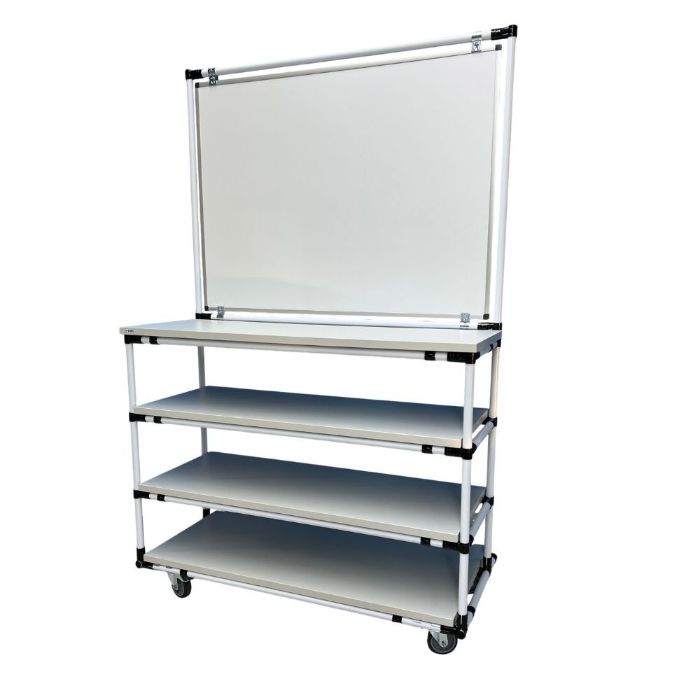 تتميز محطة العمل هذه المزودة بلوحة بيضاء مدمجة بإطار مستقر من الألومنيوم يجمع بين لوحة بيضاء مغناطيسية عمودية وهيكل تخزين متعدد المستويات أسفلها. تم تثبيت السبورة البيضاء بإحكام لتوفير سطح مرئي واضح للتعليمات أو التخطيط أو التحكم في العمليات، بينما توفر الرفوف المفتوحة أسفلها مساحة منظمة للأدوات أو المواد أو المستندات. تم تثبيت الهيكل على عجلات قابلة للقفل، مما يضمن سهولة الحركة دون المساس بالثبات، مما يجعله مثاليًا لبيئات الإنتاج أو التجميع أو التدريب المرنة حيث يعد التواصل المرئي والتخزين المنظم أمرًا ضروريًا.