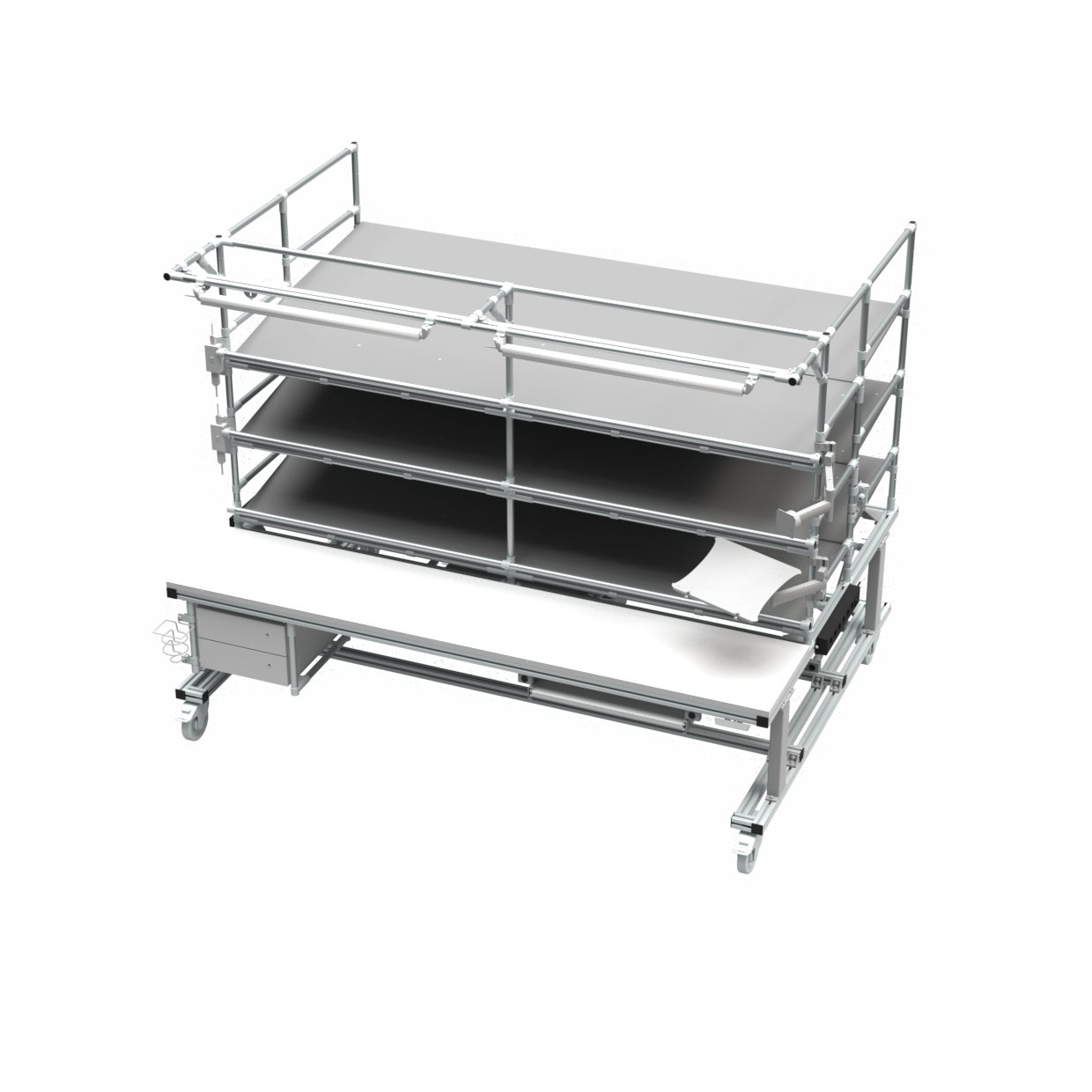 Tato mobilní pracovní stanice se vyznačuje robustním modulárním rámem se třemi prostornými policemi pro přehledné skladování materiálu. Její ergonomický design a integrovaná pracovní plocha zajišťují efektivní a pohodlnou práci, zatímco hladce se otáčející kolečka umožňují snadný pohyb mezi různými pracovními prostory. Tato pracovní stanice, ideální pro štíhlou výrobu, zvyšuje flexibilitu, organizaci a celkovou efektivitu pracovního toku.
