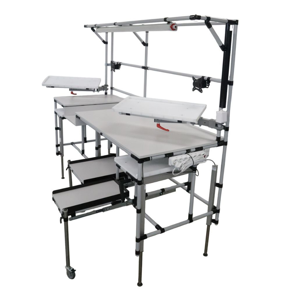 This ergonomic workstation with special spaces is designed to support efficient and well-organized production or assembly processes. The modular structure provides multiple dedicated work surfaces for different tasks, allowing tools, components, and materials to be arranged in clearly separated areas. An upper rail system enables the mounting of accessories, monitors, or lighting, while additional shelves and lower storage spaces keep frequently used items within easy reach. The sturdy frame ensures reliable everyday use, and the flexible layout helps optimize workflow, improve operator comfort, and maintain a clean, structured workspace.