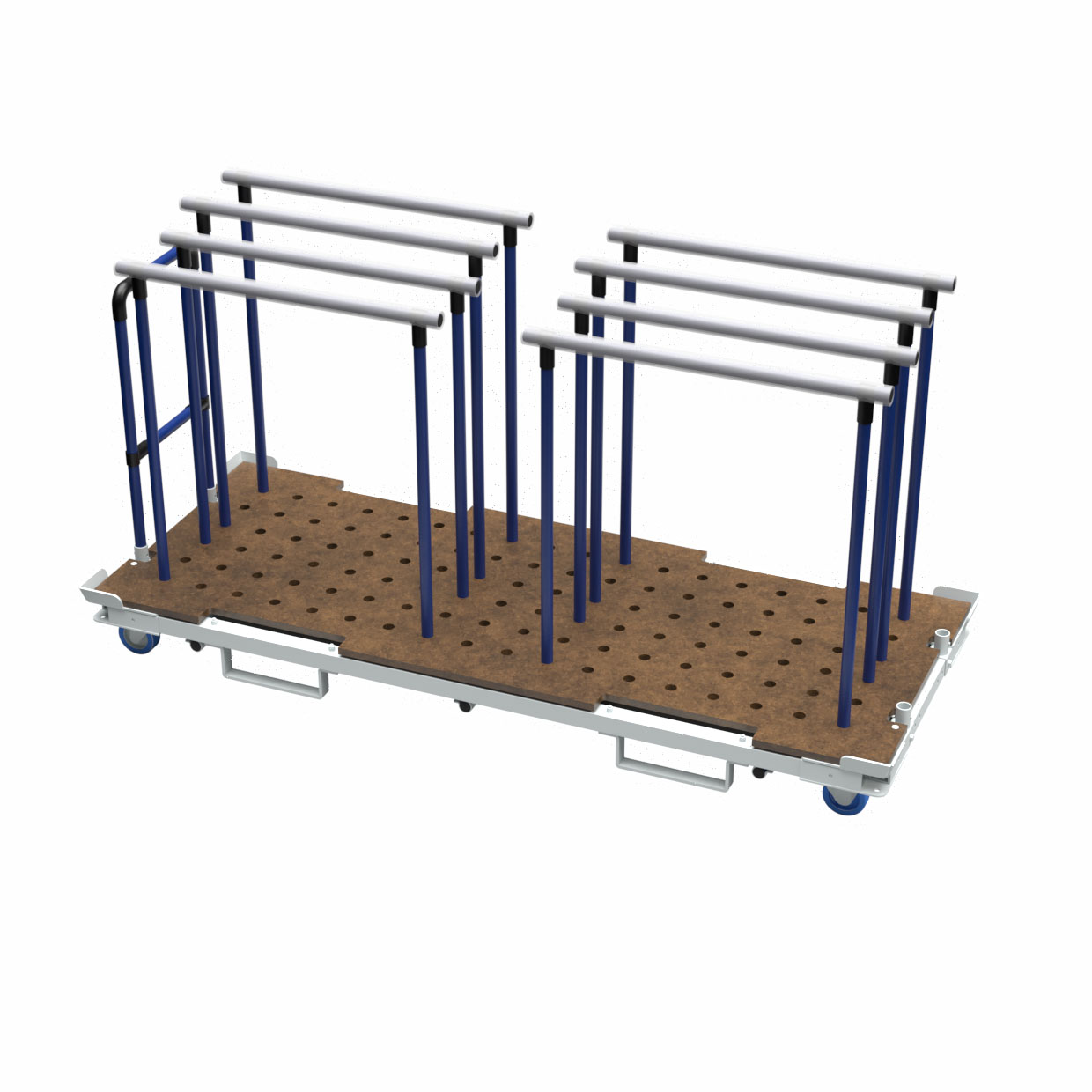 Ez az anyagszállító kocsi rugalmas és hatékony megoldást kínál az anyagok biztonságos szállításához a gyártási környezetben. Erős alapja és targoncás zsebei biztosítják a könnyű mozgatást, míg a moduláris kialakítás lehetővé teszi panelek vagy elválasztók hozzáadását a különböző alkatrészekhez. Testreszabható szerkezetével és helytakarékos elrendezésével ez a kocsi segít racionalizálni a belső logisztikát és egyszerűsíteni az anyagok kezelését a különböző munkaállomásokon.