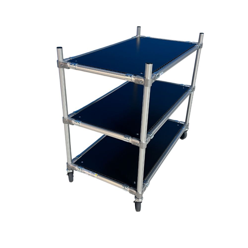 Căruciorul pentru materiale de bază are un cadru modular robust din profil de aluminiu, care asigură o stabilitate ridicată, rămânând în același timp ușor și ușor de manevrat. Cele trei rafturi solide sunt montate în siguranță în structură, oferind un suport fiabil pentru manipularea organizată a materialelor. Designul cu cadru deschis permite accesul rapid din toate părțile, în timp ce roțile pivotante integrate asigură o mobilitate lină și o poziționare precisă, chiar și în spații industriale înguste. Proiectată pentru durabilitate și flexibilitate, structura căruciorului poate fi ușor adaptată sau extinsă pentru a se potrivi cerințelor în schimbare ale fluxului de lucru.