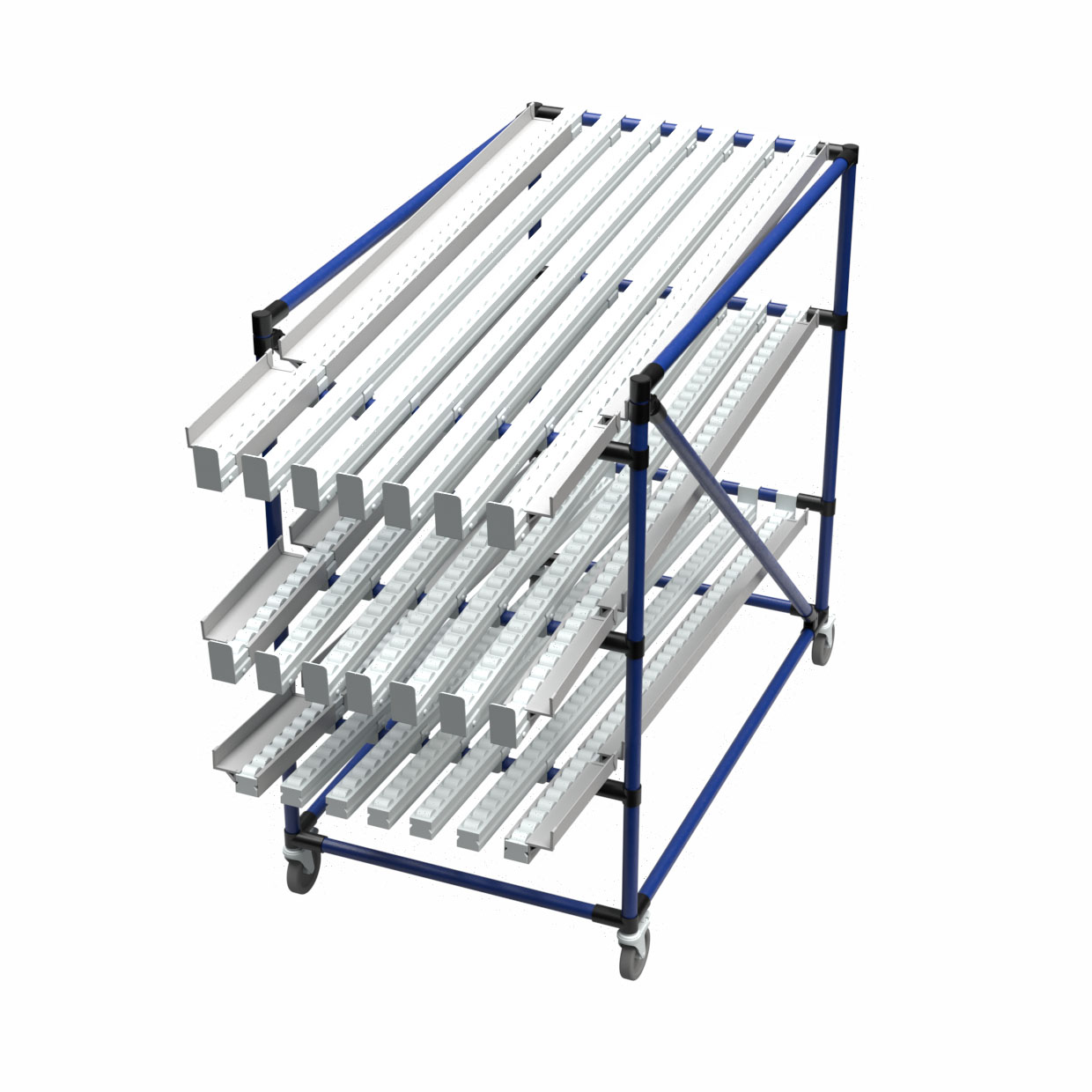 Ovaj višeslojni flow rack dizajniran je za efikasno rukovanje materijalom, omogućavajući glatku FIFO (First In, First Out) isporuku kroz nagnute valjkaste staze koje osiguravaju pouzdan pokret delova ka operateru. Njegov čvrst okvir od cevi i spojeva podržava više traka, omogućavajući organizovano odvajanje komponenti i maksimalno iskorišćenje prostora u proizvodnom pogonu. Opremljen je teškim točkovima, što rack čini veoma mobilnim i lakim za premještanje unutar bilo kog proizvodnog okruženja.